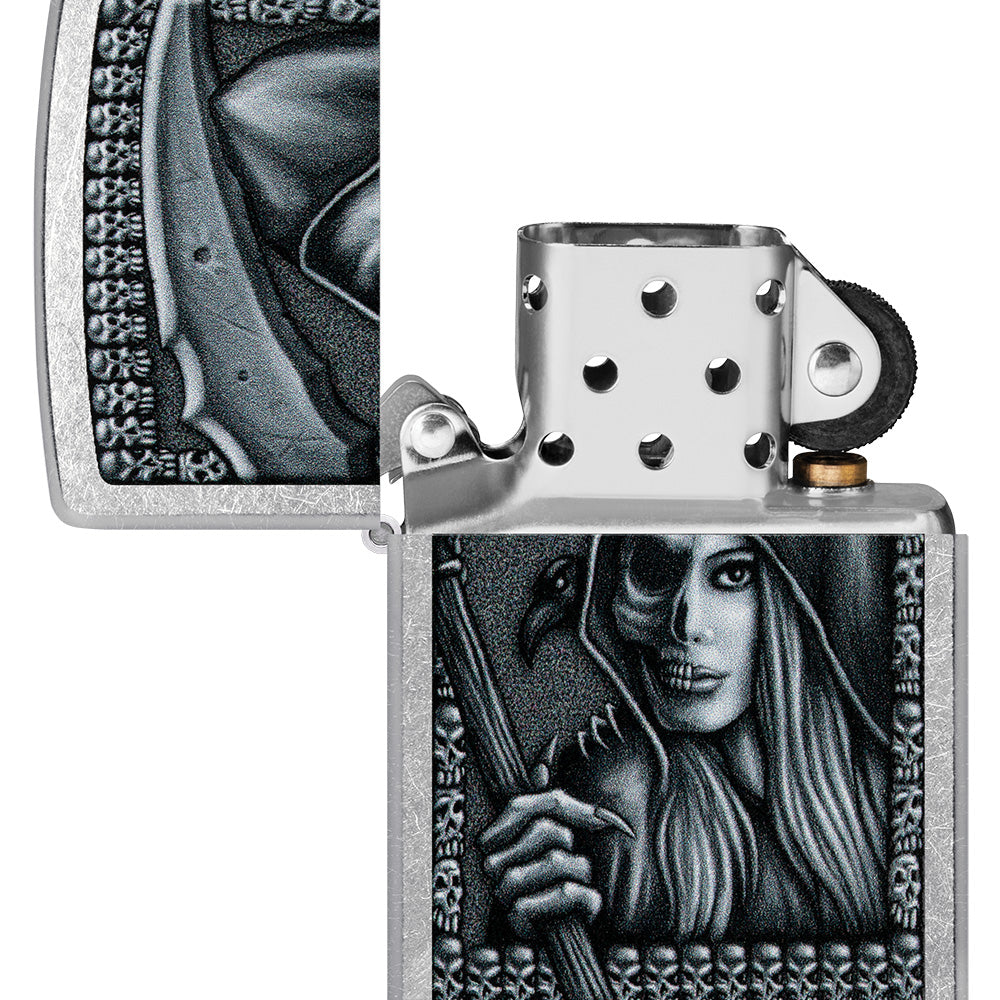 Questo classico accendino Street Chrome raffigura il Triste Mietitore in una luce leggermente diversa, grazie al suo affascinante design. Accendino antivento Horror a benzina ricaricabile, antivento, made in the USA. Viene confezionato in una scatola regalo. Per prestazioni ottimali, utilizzare il fluido di ricarica originale per accendini Zippo.