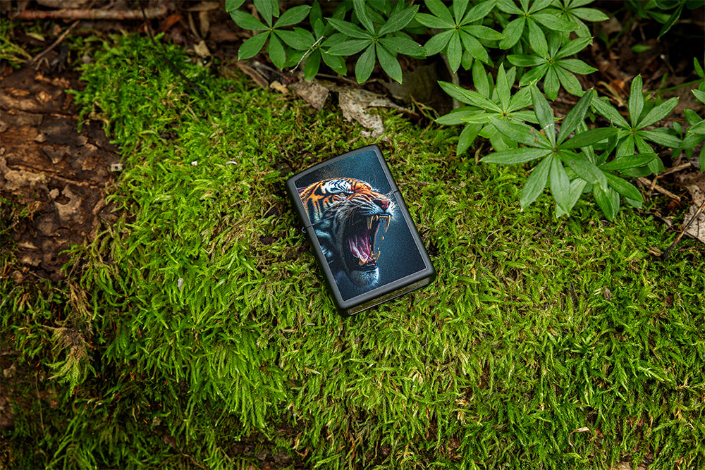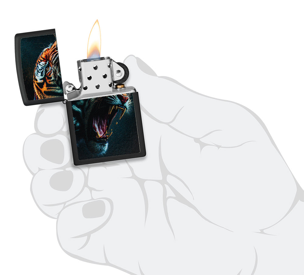 Una tigre feroce e realistica prende vita sulla superficie di questo accendino Nero Opaco, grazie a un design Color Image ricco di dettagli e intensità. Accendino antivento Zippo Fierce Tiger a benzina ricaricabile, antivento, made in the USA. Viene confezionato in una scatola regalo. Per prestazioni ottimali, utilizzare il fluido di ricarica originale per accendini Zippo.