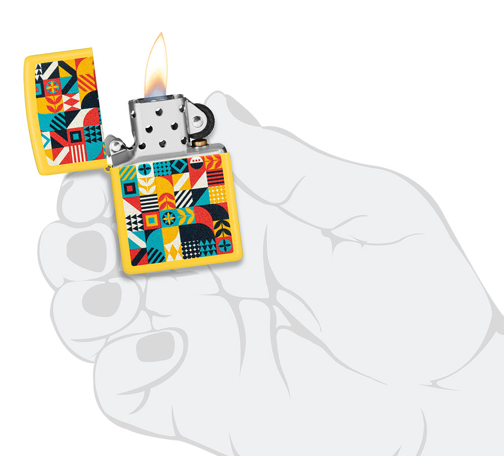 Un accendino vivace e geometrico con design, caratterizzato da motivi astratti in rosso, giallo, blu e nero. Il contrasto tra i colori accesi e la base gialla ne esalta modernità e originalità. Realizzato con la tecnologia 540 Color, è perfetto per chi ama uno stile contemporaneo e ricco di personalità. Accendino antivento Zippo Geometric Pattern a benzina ricaricabile, antivento, made in the USA. Viene confezionato in una scatola regalo. Per prestazioni ottimali, utilizzare il fluido di ricarica originale per accendini Zippo.
