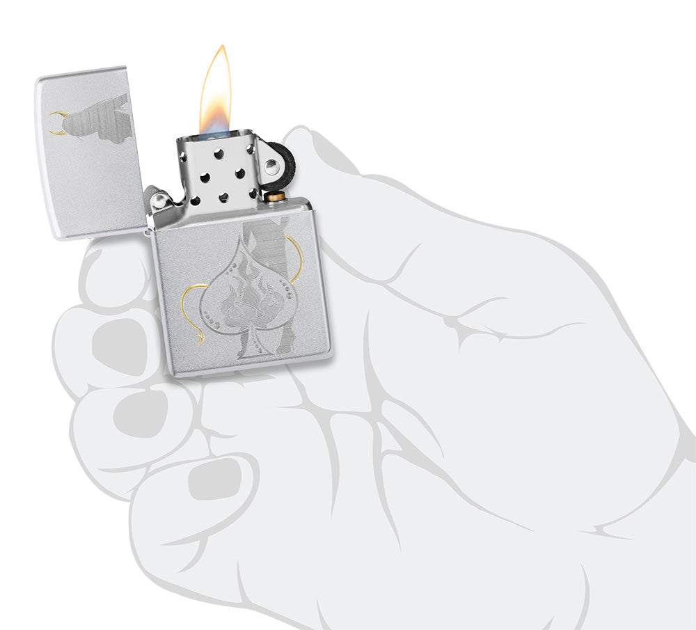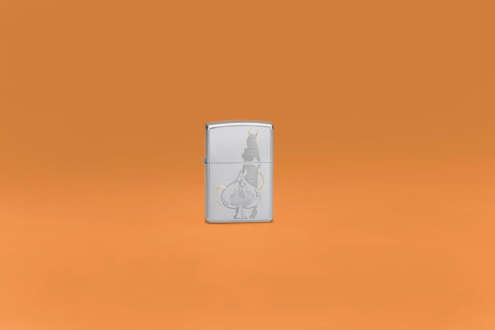Una seducente succube diabolica prende vita dietro un Asso di Picche su questo raffinato accendino Satin Chrome. Il design ricco di dettagli, unito alle eleganti tonalità dorate dell'ottone, è ottenuto attraverso l'esclusivo processo Auto Two-Tone, che dona profondità e carattere all'incisione. Accendino antivento Zippo Devilish Ace a benzina ricaricabile, antivento, made in the USA. Viene confezionato in una scatola regalo. Per prestazioni ottimali, utilizzare il fluido di ricarica originale per accendini Zippo.