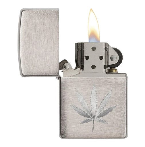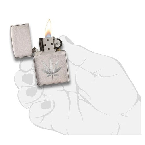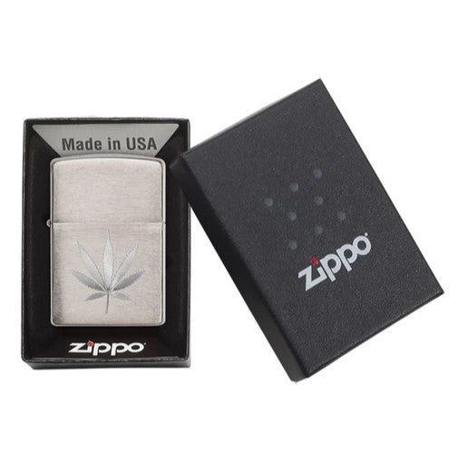 Questo modello presenta una foglia di marijuana incisa sulla superficie di un classico accendino Cromo spazzolato. Viene confezionato in una scatola regalo. Per prestazioni ottimali, utilizzare il fluido di ricarica originale per accendini Zippo.