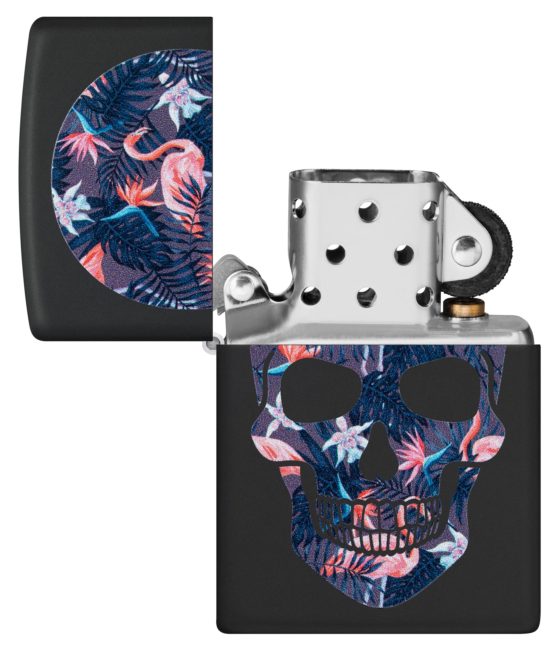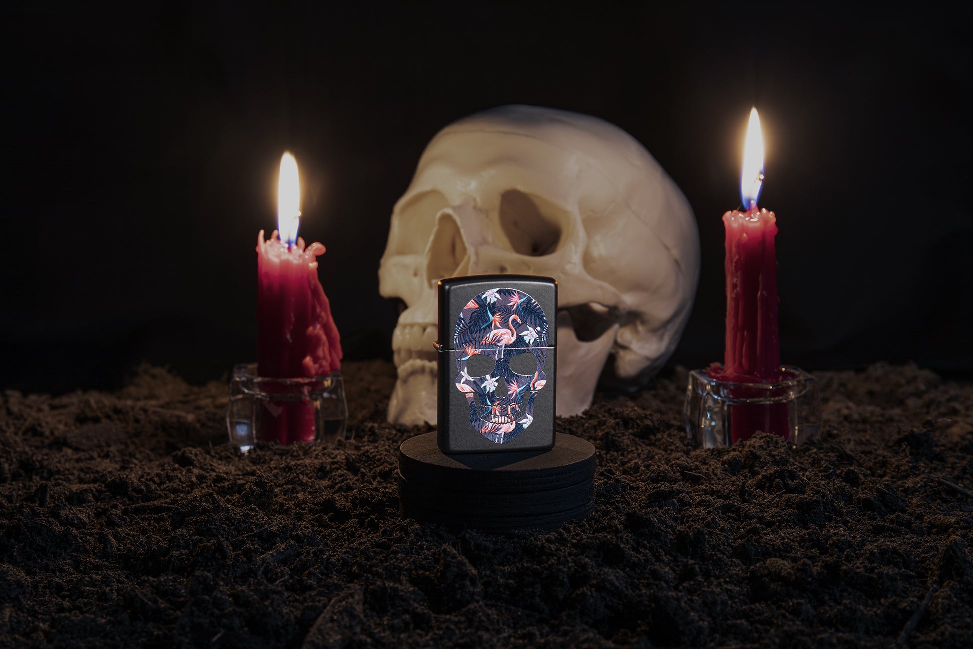 Spettrale e dolce si fondono in questo macabro e giocoso accendino Black Matte. Fenicotteri e fiori riempiono un teschio usando il nostro processo Immagine a colori. Viene confezionato in una scatola regalo. Per prestazioni ottimali, utilizzare il fluido di ricarica originale per accendini Zippo.