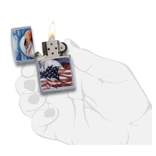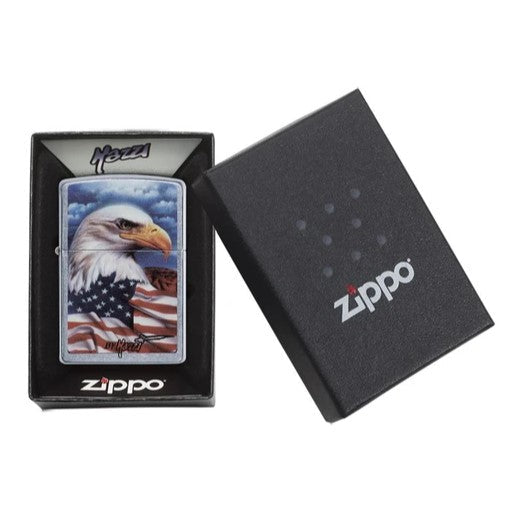Questo accendino Street Chrome ™ ha un'immagine a colori con design patriottico. Viene confezionato in una scatola regalo. Per prestazioni ottimali, utilizzare il fluido di ricarica originale per accendini Zippo.