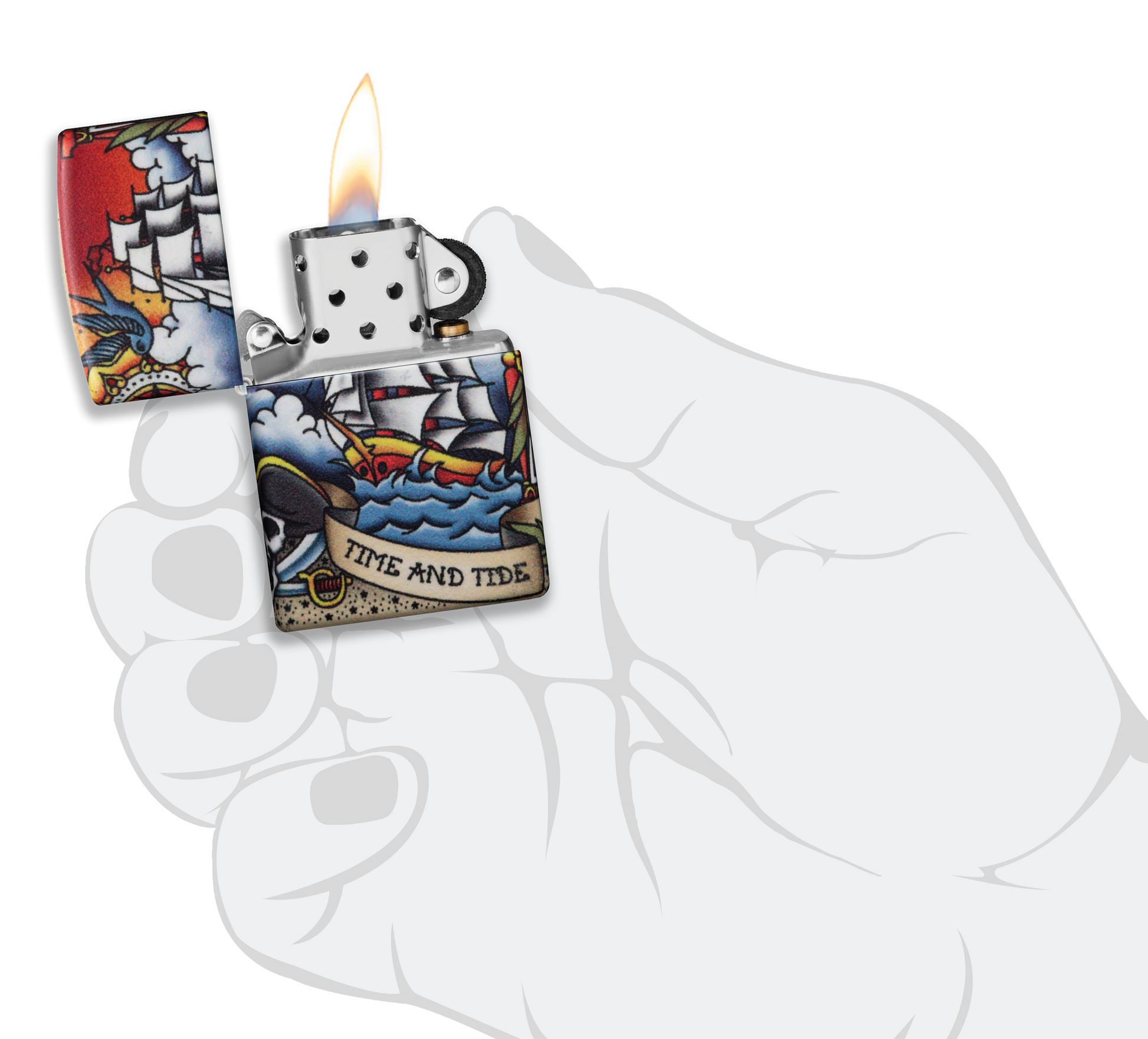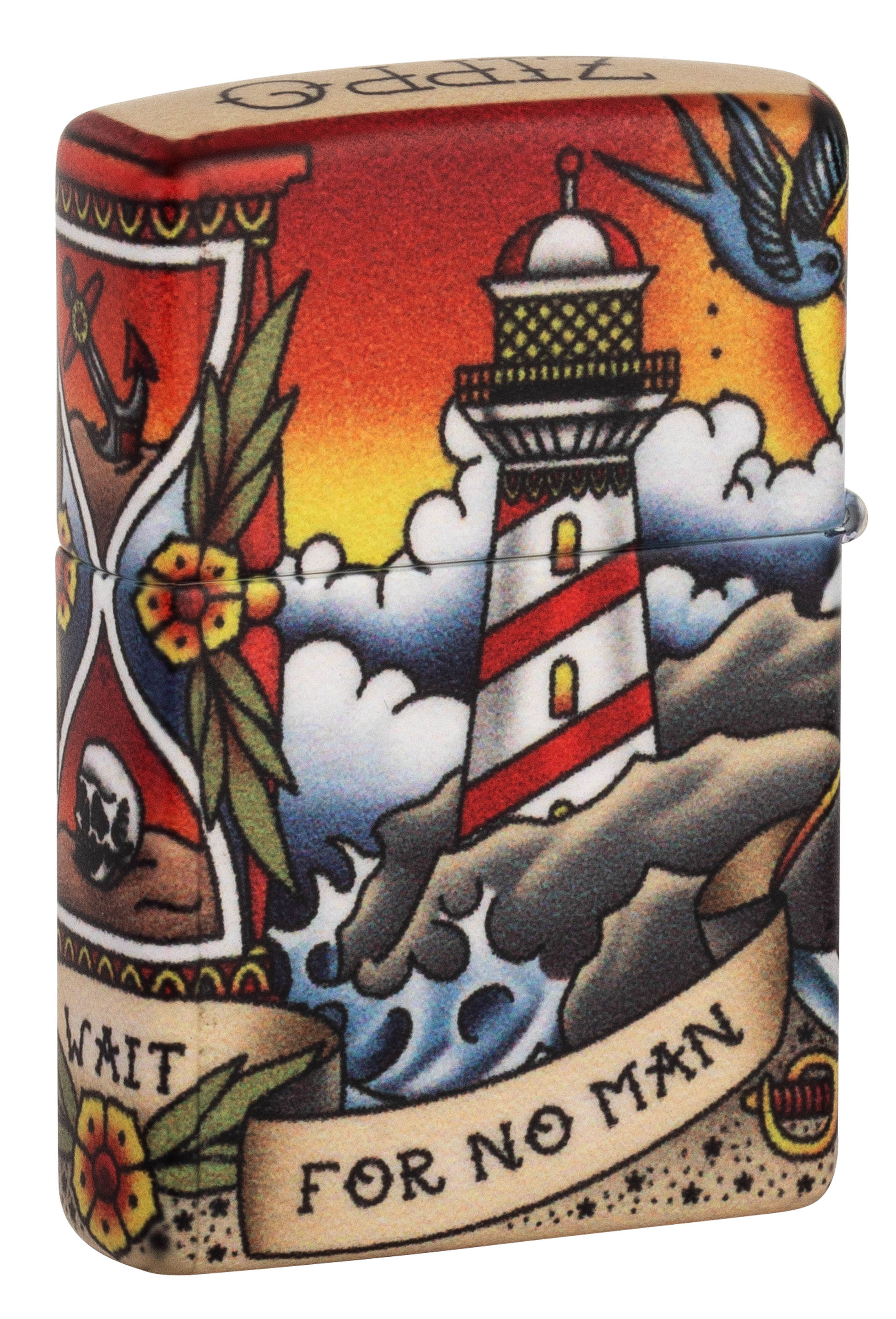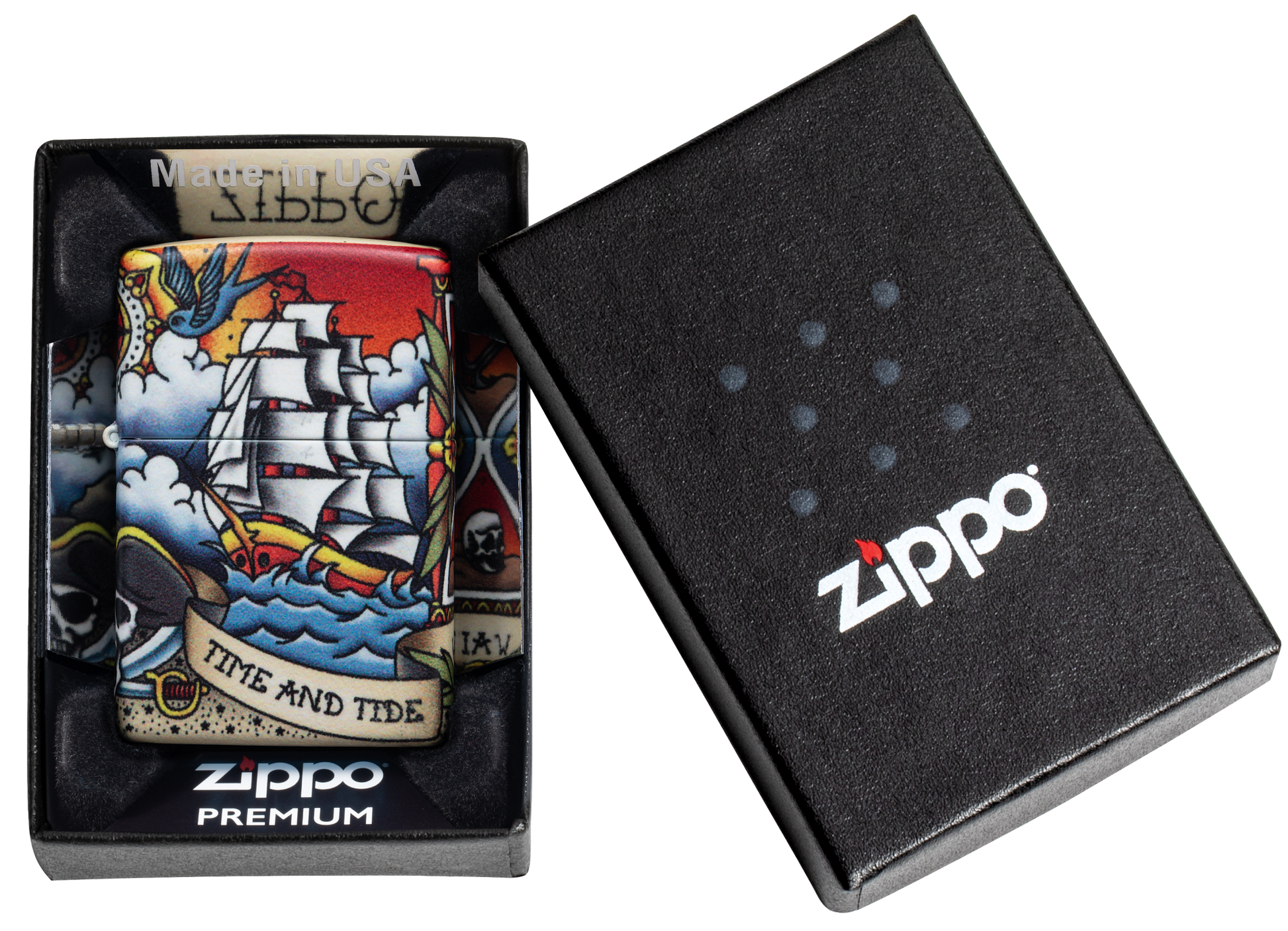 "Il tempo e la marea non aspettano nessuno" - Trova questa citazione iconica in una sceneggiatura che avvolge questo classico accendino Nautical Tattoo Design. Che tu sia un fan dello stile del tatuaggio tradizionale americano o del design ispirato al mare aperto, questo design è destinato a riportarti indietro nel tempo dei negozi di tatuaggi vintage. Questo design utilizza il processo 540 Colour di Zippo, che consente la copertura completa della superficie dell'accendino con grafica di precisione. In tutto questo design ci sono elementi di ispirazione nautica come la nave clipper che naviga sulla parte anteriore e il faro che brilla sul retro. Viene confezionato in una scatola regalo. Per prestazioni ottimali, utilizzare il fluido di ricarica originale per accendini Zippo.