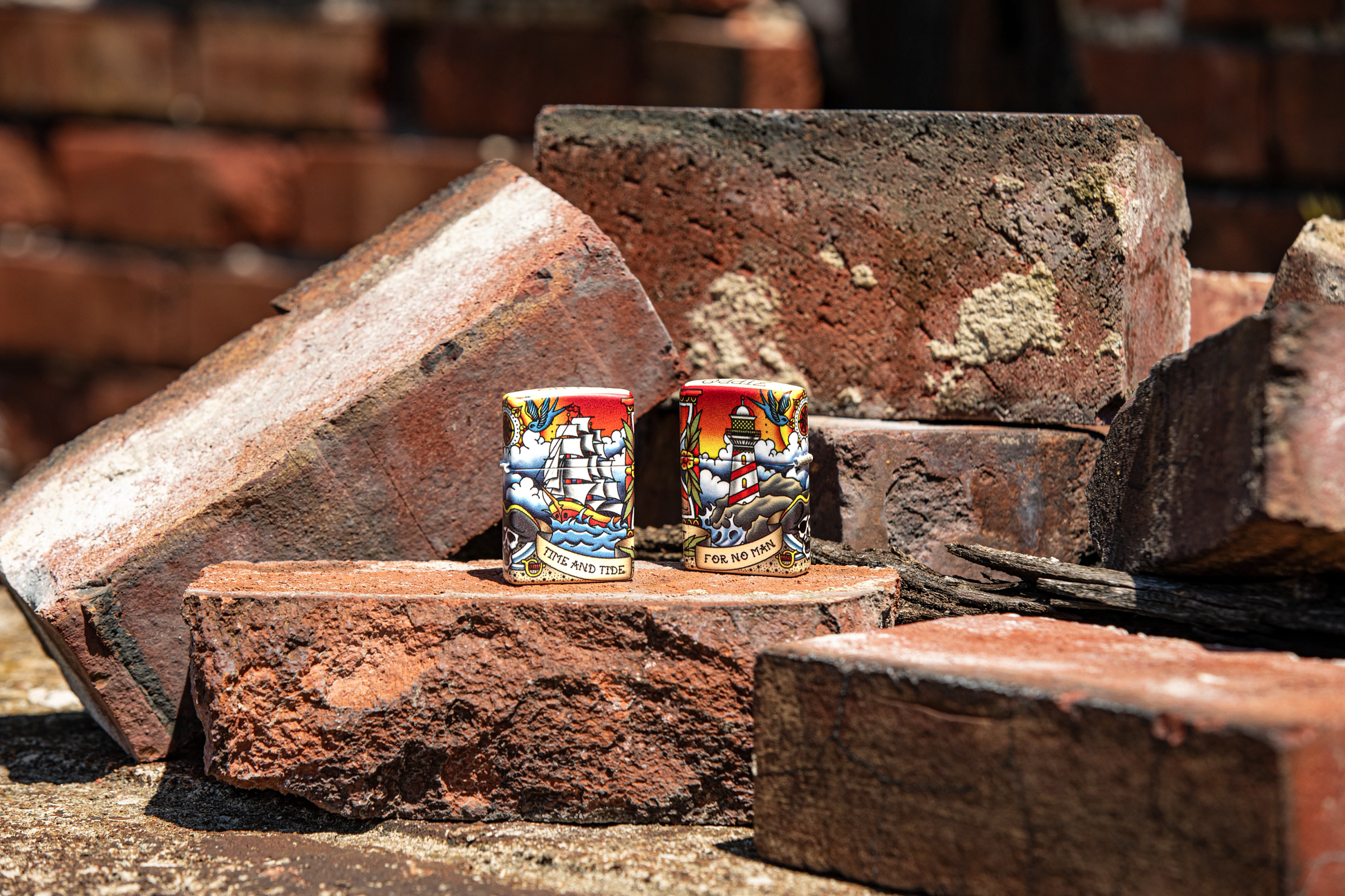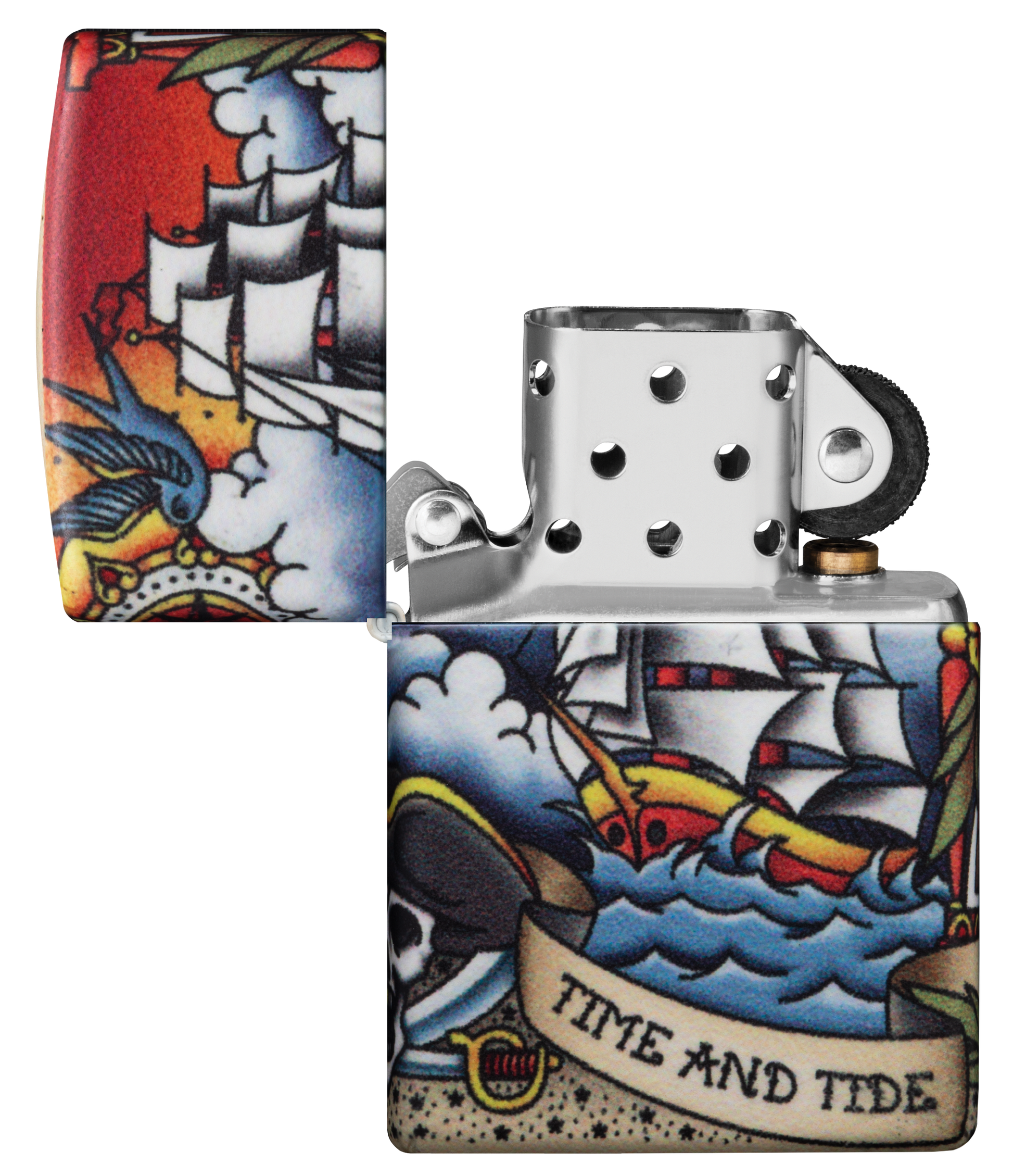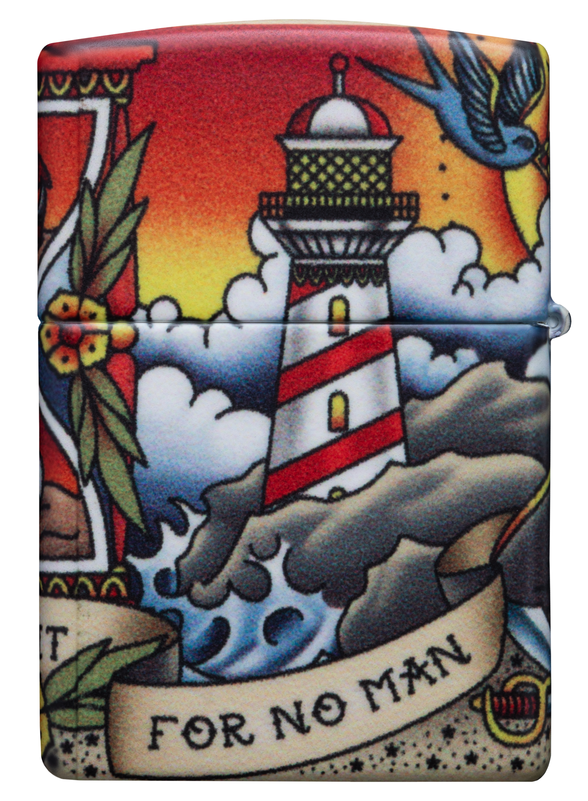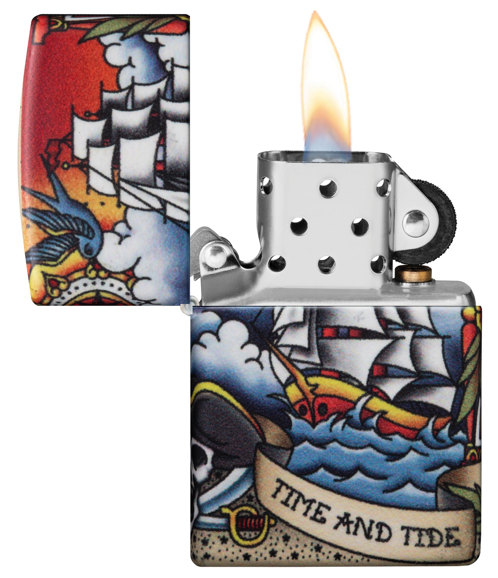 "Il tempo e la marea non aspettano nessuno" - Trova questa citazione iconica in una sceneggiatura che avvolge questo classico accendino Nautical Tattoo Design. Che tu sia un fan dello stile del tatuaggio tradizionale americano o del design ispirato al mare aperto, questo design è destinato a riportarti indietro nel tempo dei negozi di tatuaggi vintage. Questo design utilizza il processo 540 Colour di Zippo, che consente la copertura completa della superficie dell'accendino con grafica di precisione. In tutto questo design ci sono elementi di ispirazione nautica come la nave clipper che naviga sulla parte anteriore e il faro che brilla sul retro. Viene confezionato in una scatola regalo. Per prestazioni ottimali, utilizzare il fluido di ricarica originale per accendini Zippo.