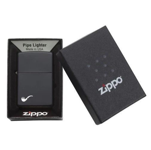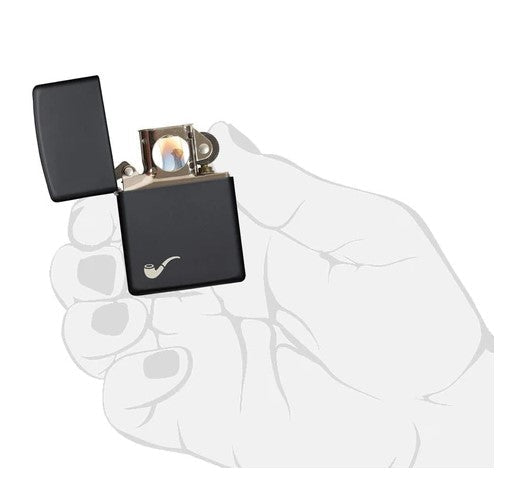 Questo accendino per pipa nero opaco è stato progettato per le esigenze speciali dei fumatori di pipa. L'inserto per pipa consente all'utente di dirigere e attirare la fiamma gialla verso il basso senza bruciare il tubo. Il risultato: tabacco perfettamente illuminato, senza danni alla pipa. Viene confezionato in una scatola regalo. Per prestazioni ottimali, utilizzare il fluido di ricarica originale per accendini Zippo.