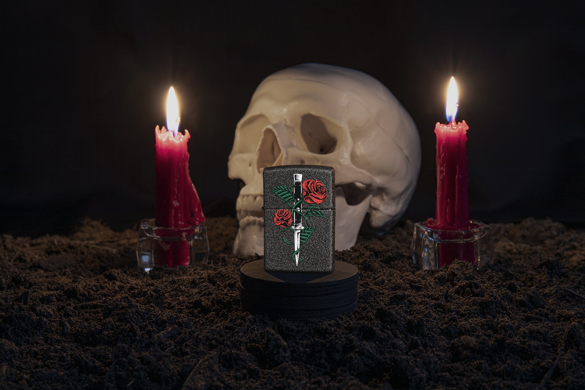 Niente batte un classico. Il disegno di una rosa e un pugnale che appare su questo accendino Black Crackle® utilizzando il nostro processo di immagine a colori per un pezzo che è tanto cool come la vecchia scuola. Viene confezionato in una scatola regalo. Per prestazioni ottimali, utilizzare il fluido di ricarica originale per accendini Zippo.