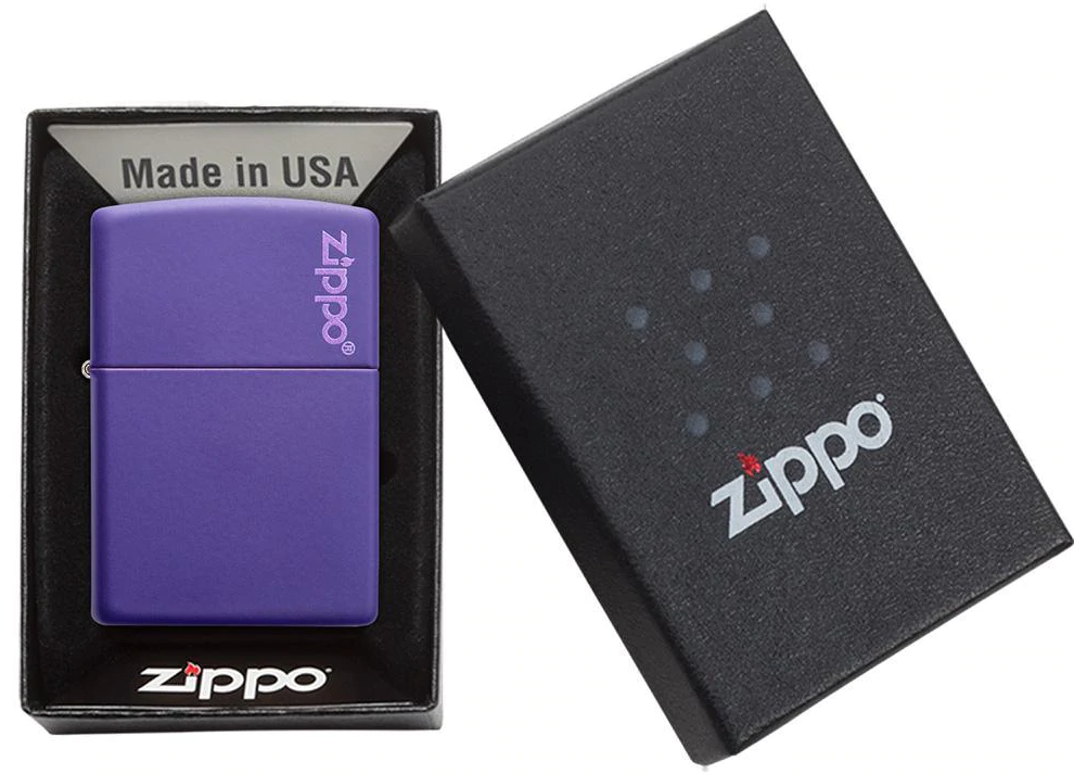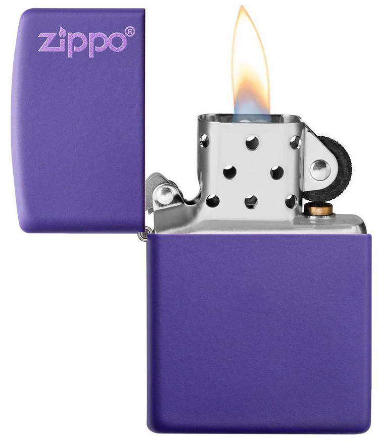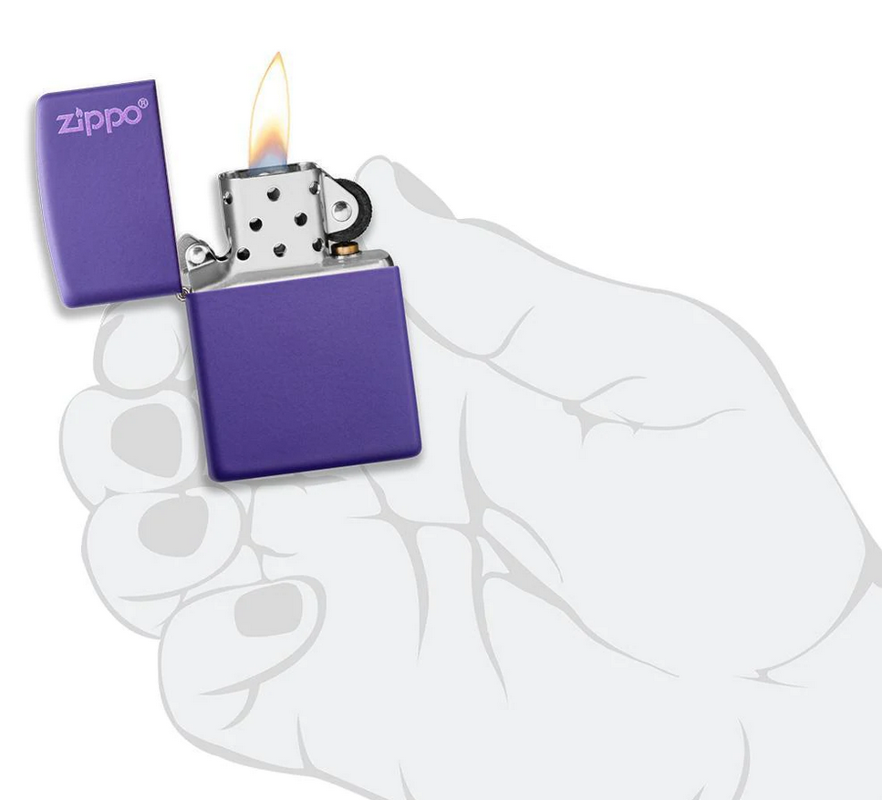 L'accendino Purple Matte è tornato ed è pronto per l'azione. Questo splendido modello mostra una tonalità viola intenso e ha una cerniera laserata e un timbro inferiore. Questo accendino antivento viola opaco è decorato con il classico logo Zippo. Viene confezionato in una scatola regalo. Per prestazioni ottimali, utilizzare il fluido di ricarica originale per accendini Zippo.